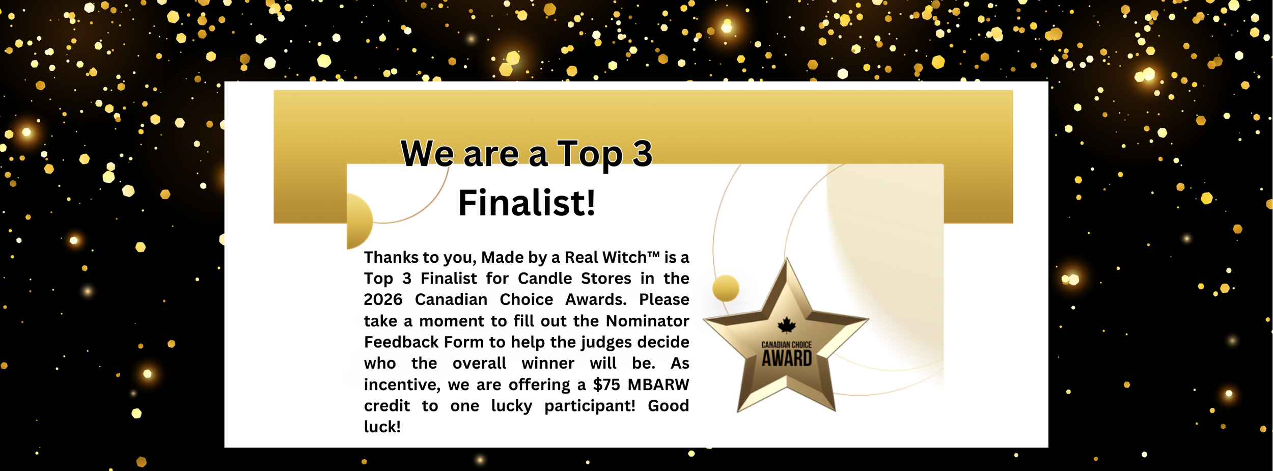 We never expected to make it this far and humbly thank you for your support. Thanks to you - our loyal customers - Made by a Real Witch™ is a top 3 finalist for Best Candle Stores in the 2026 Canadian Choice Awards. That is a really big honor for us and we'd love to win. It only takes a minute or two of your time. Your support is greatly appreciated.